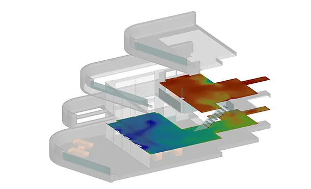 A Computational Fluid Dynamics (CFD) study was performed on behalf of Novenco Marine & Offshore to assess the performance of the ventilation system within a multi-deck ship environment. The goal was to identify hot zones and modify airflow distribution so that more cooling air is delivered to these regions. Using Ansys Fluent, Simtec team modeled complex heat dissipation from engines and gensets and simulated airflow from supply ducts under realistic operating conditions.Advanced CFD Analysis for Efficient Climate Control in Α Luxury Residential Complex in Voula, Attica
