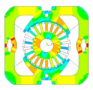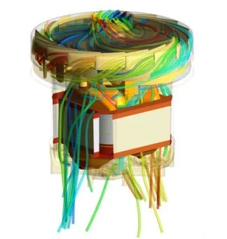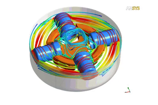With the use of ANSYS Fluent the motor structure is designed to have low aero-dynamic losses and to provide sufficient cooling of the electrical motor (Image 2). Simulation of mechanical stresses and natural frequencies of components further enables better mechanical design (Image 3). Simulations are made also after the testing of the first prototypes. At this stage accurate experimental data are available and detailed optimisation is performed.