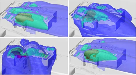 For the external analysis, a 3D model was created by capturing the topography and surrounding buildings using Google Earth, in order to account for the influence of terrain on airflow. Various scenarios of wind speed and direction were simulated based on the area's meteorological data, focusing on the most thermally adverse summer conditions. The primary objective was to identify problematic zones where temperatures exceeded acceptable limits, as well as areas of potential “thermal short-circuiting”, where hot air exiting the AC units could re-enter their intake, leading to significant cooling inefficiencies.