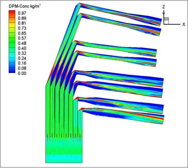 Coal particle distribution inside air-coal mixture channels has been obtained as result of performed simulations. Provided numerical simulation was successful in determination of the influence of movable shutters inclination on pulverized coal particles distribution in air-coal mixture channels.